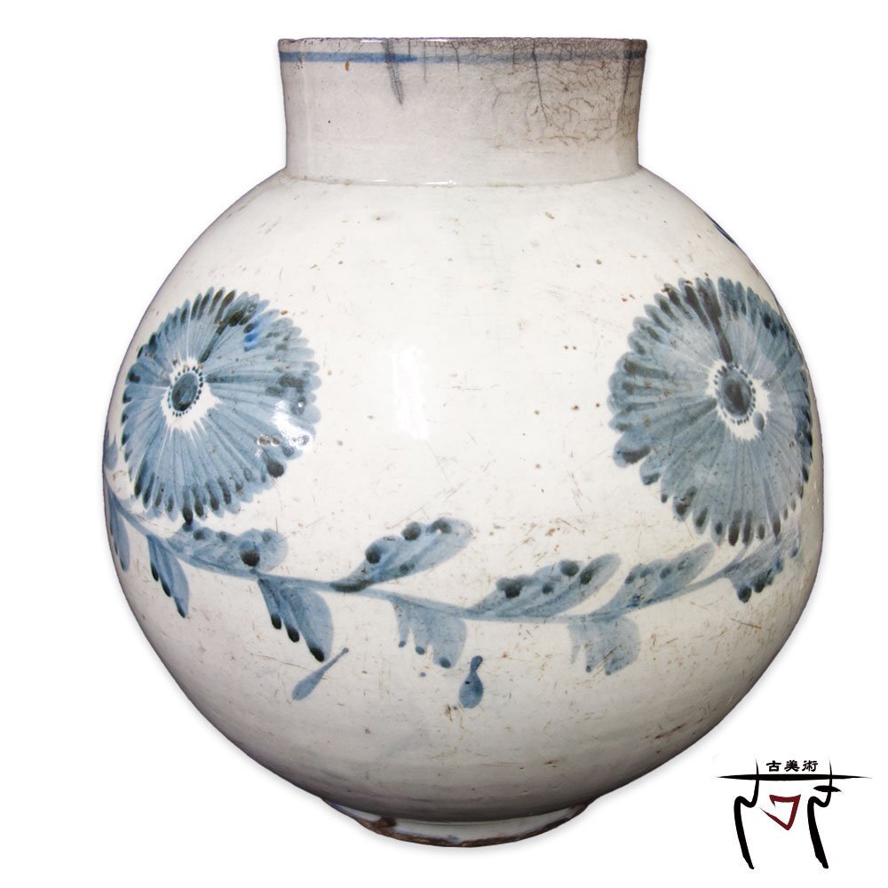 - 【中古】M▽李朝 李氏朝鮮時代 李王朝中期 染付 壺 丸壺 丸型 花器 花文 花弁文 (K 00300)