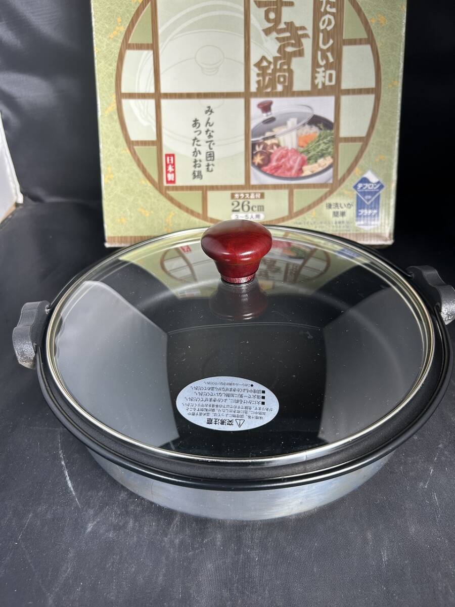 - D 566 26㎝ ガラス蓋付 すき焼き鍋 日本製 3~5人用 中古
