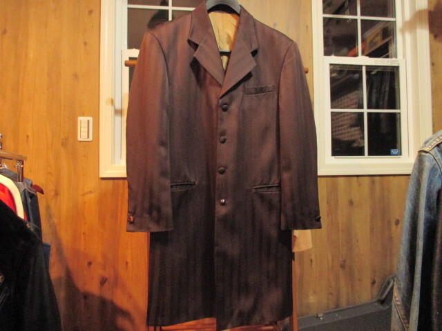 - オールド ヴィンテージ 米国製 ブラウン ストライプ テーラード ロングジャケット ステンカラーコート ユニオンチケット FALCONE 茶 縦縞