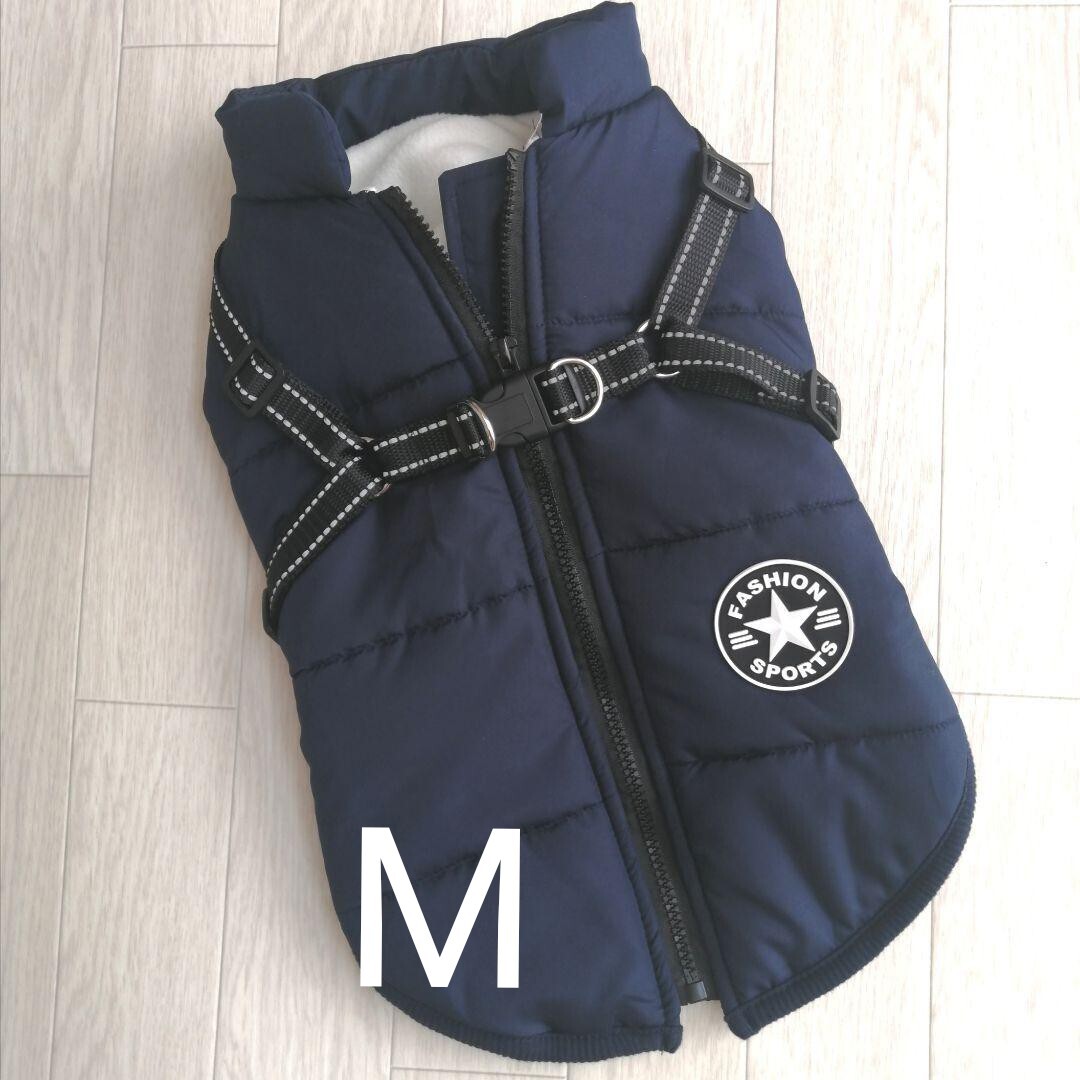> M ネイビー 犬服 裏ボアダウン風ベストバックファスナー ハーネス付 背中ファスナー 背中開き 着せやすい 反射加工 撥水加工