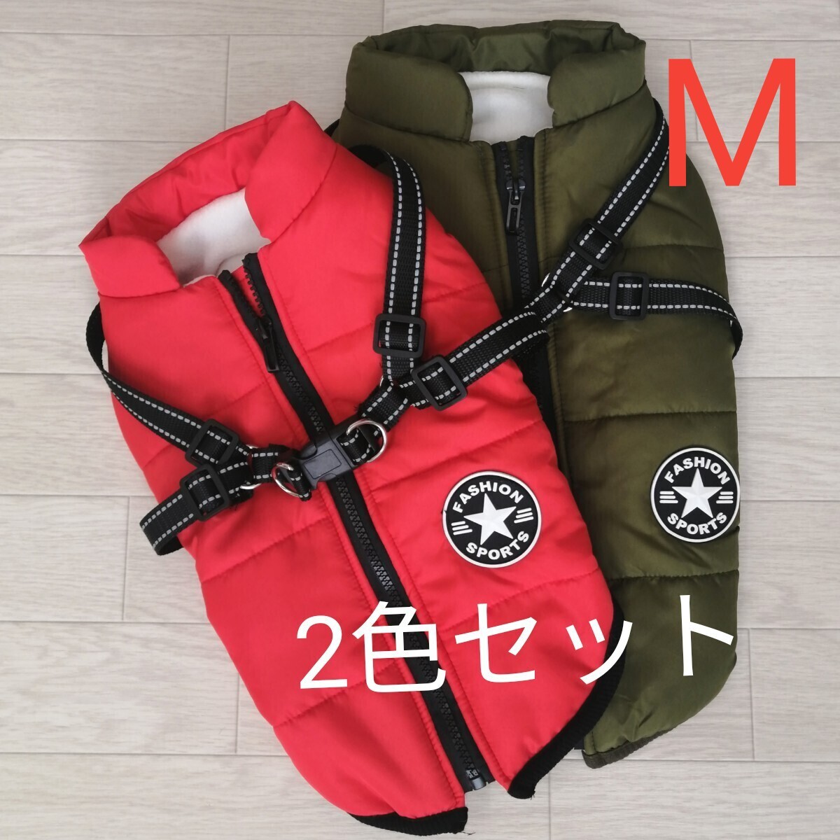 > M 2色セット レッド/カーキ 犬服 裏ボアダウン風ベストバックファスナー ハーネス付 背中ファスナー 背中開き 反射加工 撥水加工