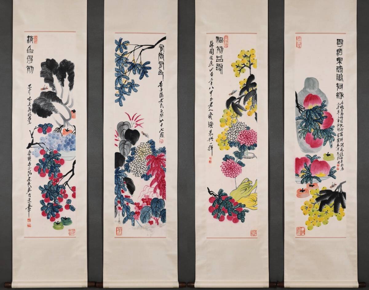 - 古美術 掛け軸 中国・近現代 「斉白石書」 紙本 【寿酒果香草虫図四条屏】 立軸 書道 巻き物 肉筆保証 唐物 古画 LT-241211