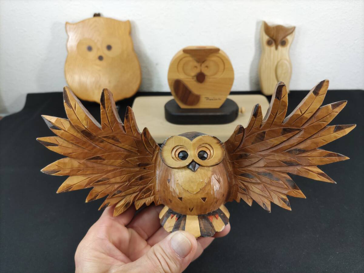 - ■送料無料!■まとめて■フクローの印鑑入れ■フクロウ■民芸品■象嵌・鍋敷き・壁掛け■栓抜き■まな板■木製■5点セット!