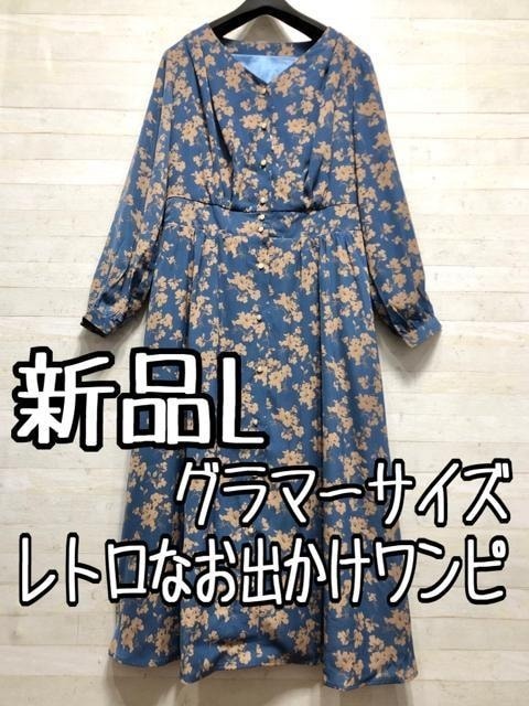 - 新品☆Lグラマーサイズ♪ブルー系花柄♪レトロなお出かけワンピース〇B572