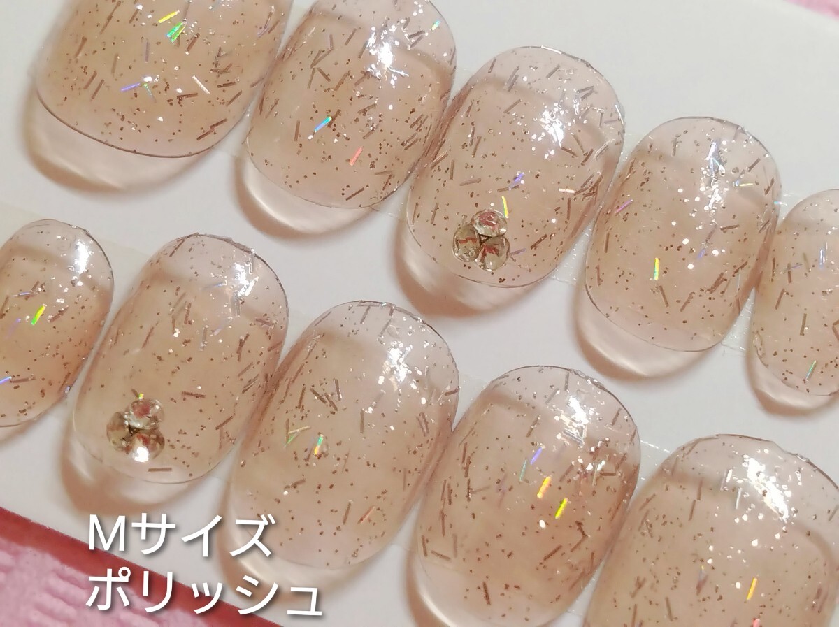 - Mサイズベリーショート・透け感くすみピンクベージュ長ホログラムラメキラキラネイルチップつけ爪ラインストーン