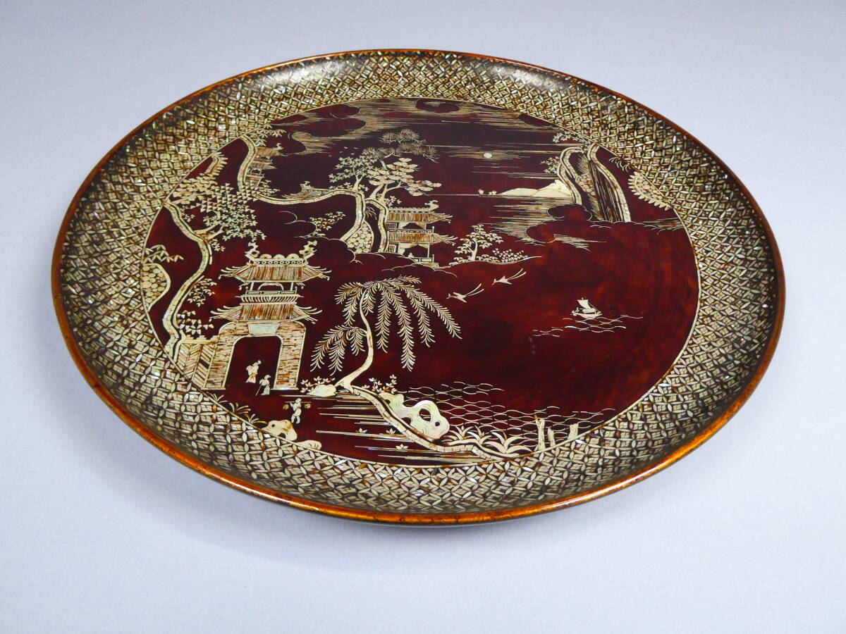 - 螺鈿飾り丸盆 楼閣山水図 木製漆芸