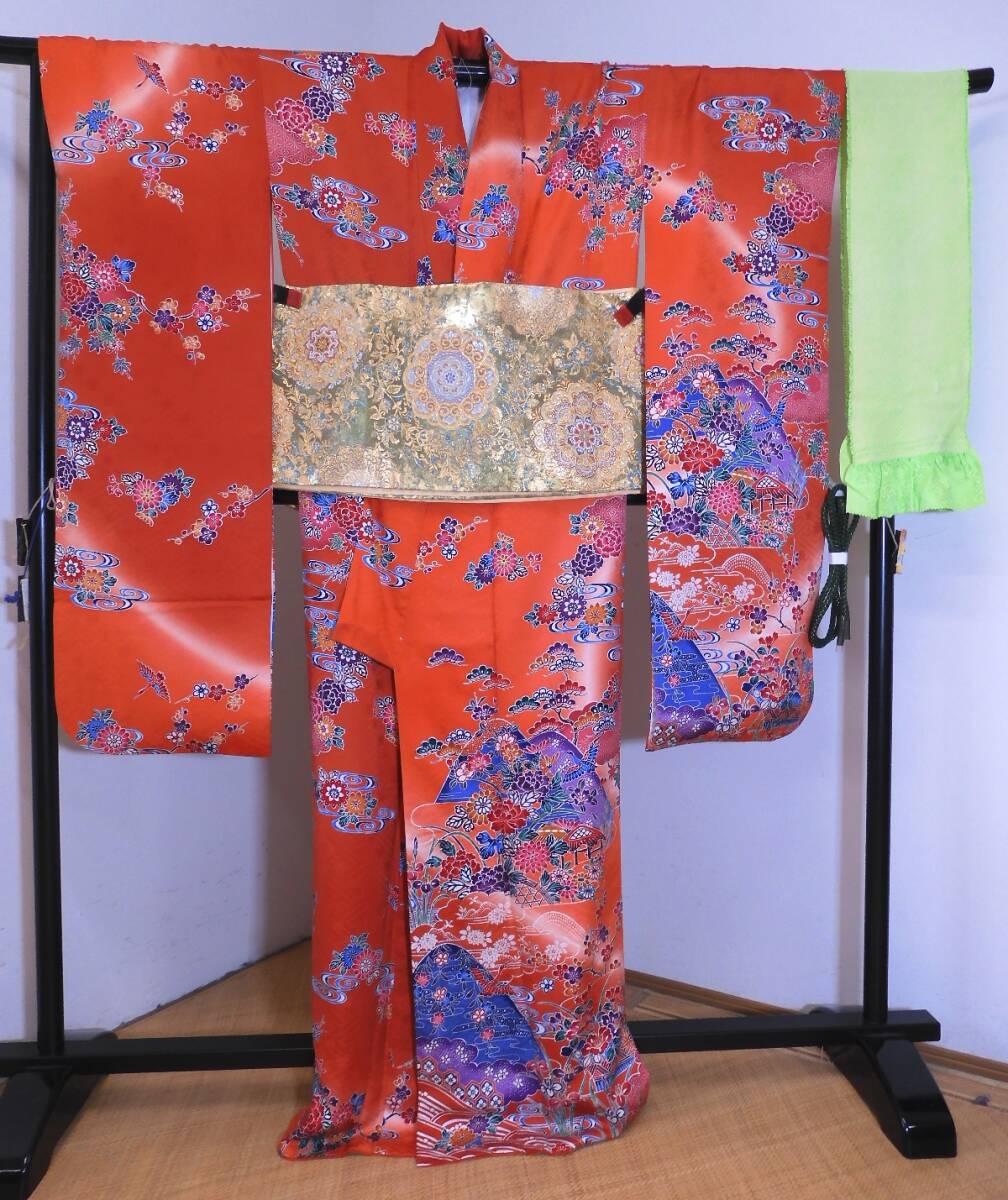 - <銀の斧>正絹・赤色振袖5点セット・着物・長襦袢・袋帯・帯揚げ・帯締め・現代サイズ