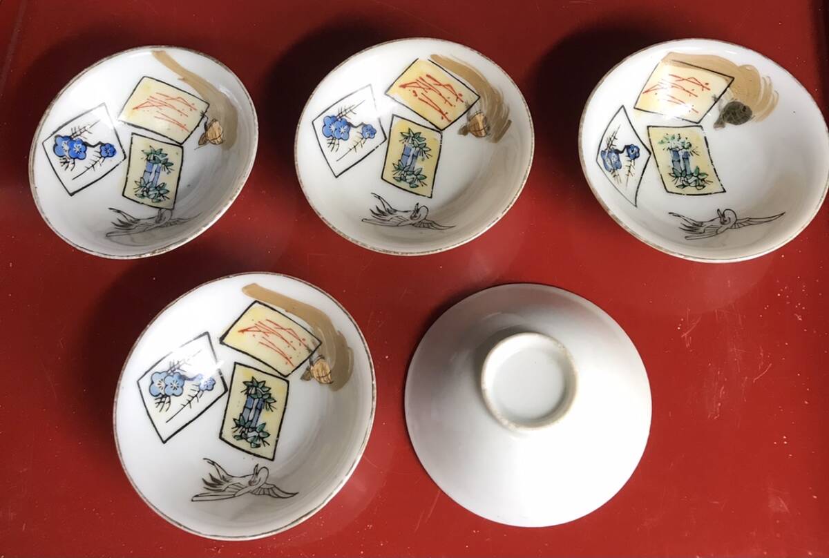 - ★S3★お猪口★ぐい呑★酒器★年代物★和食器★アンティーク★レトロ★店舗★色絵★金彩★鶴★亀★松竹梅★5個★