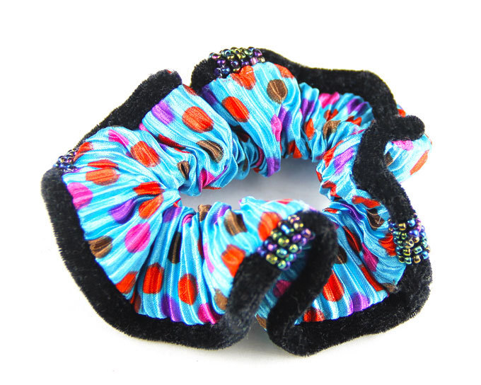 - ヘアアクセサリー シュシュ ヘアゴム 水玉 ドット ビーズ プリーツ ヘアアレンジ ブルー ポイント消化 mimosa