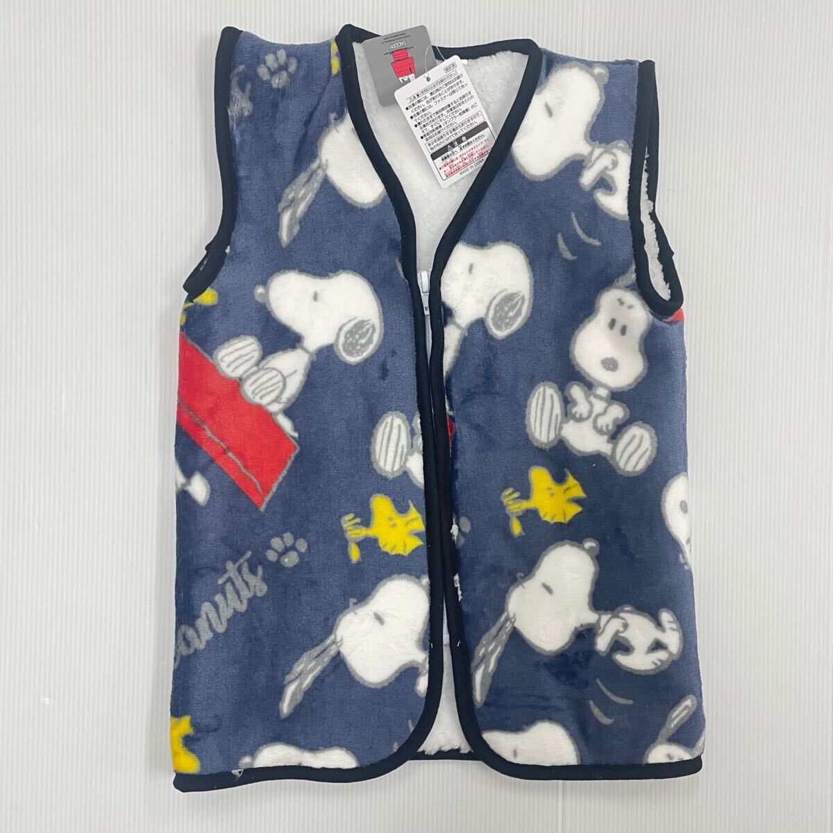- 新品63496スヌーピー紺ネイビーキッズフランネル 裏ボア スリーパー ベスト 男女兼用 あったか素材 防寒前開きジップパジャマ子供100-120cm
