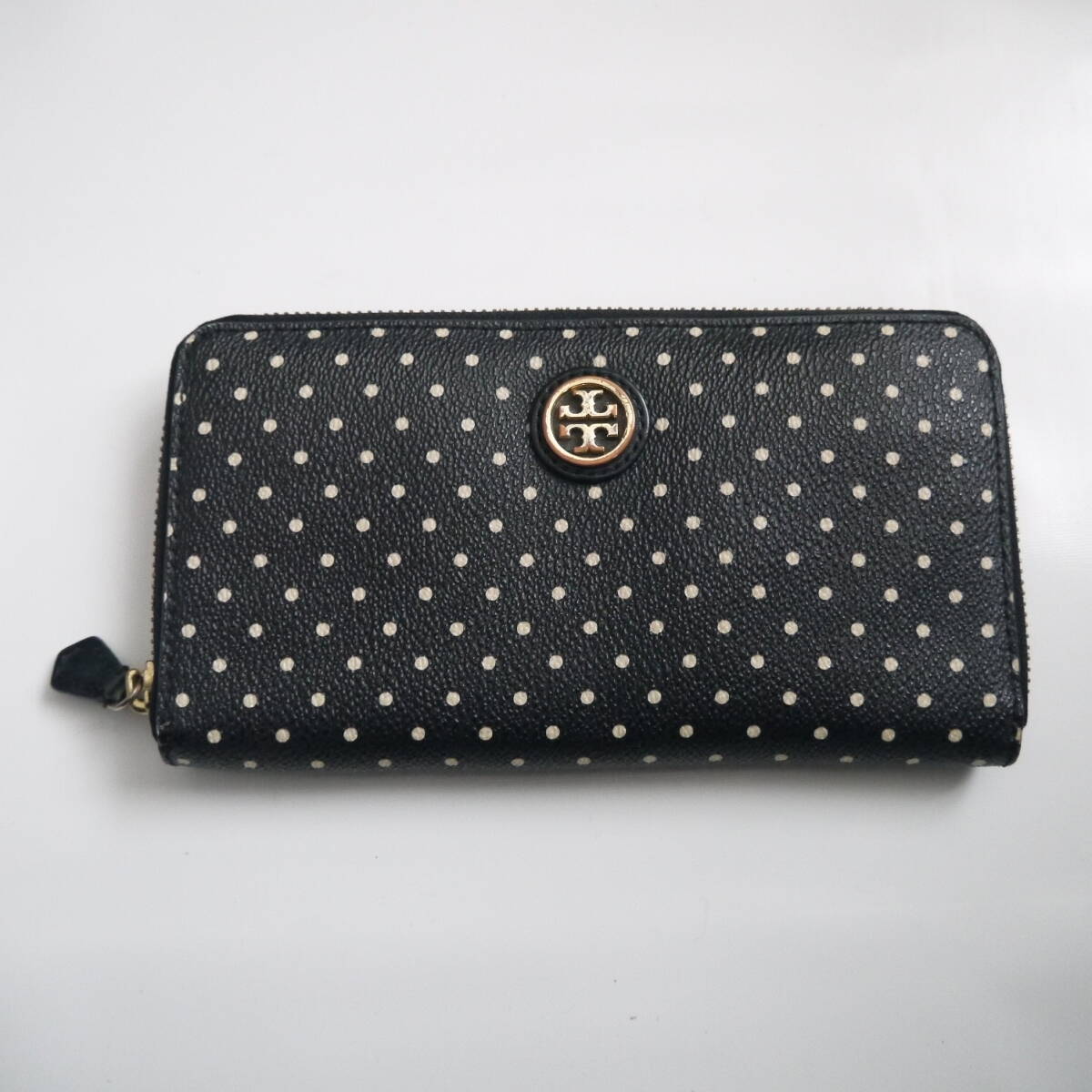 - $ 美品 $ 訳あり ◆ TORY BURCH ◆ トリーバーチ ◆ ラウンドファスナー 長財布 ◆ ロゴ入り ドット 総柄 レザー製◆ 黒 ブラック◆ 激レア