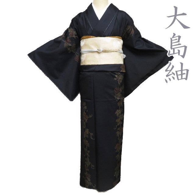 > 大島紬 着物 中古 正絹 袷 セミフォーマル 葡萄模様 蔦 黒鳶色 多色 身丈156.5cm 裄64.5cm M きもの北條 A1132-7