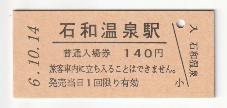 - 平成6年10月14日 中央本線 石和温泉駅 140円硬券普通入場券(日付印刷)
