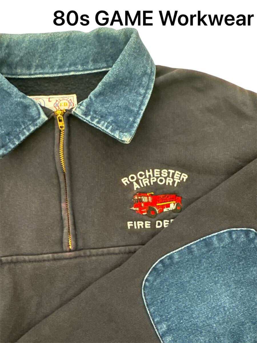 > 80s 刺繍 デニム エルボーパッチ タロンジップ game workwear スウェット 黒 アメリカ古着 US古着 消防車 切替し グランパコア 襟付き