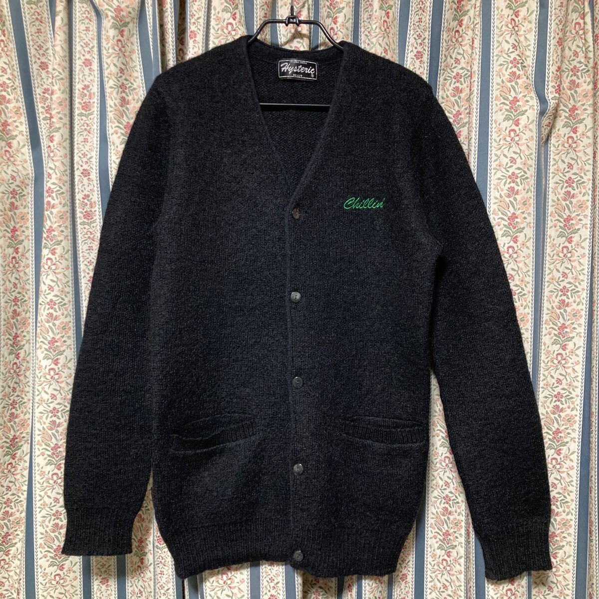 - ヒステリックグラマー Chillin’ロゴ刺繍 モヘヤ ウール ニット カーディガン Vネック 長袖 ブラック×グリーン セーター ユニセックス