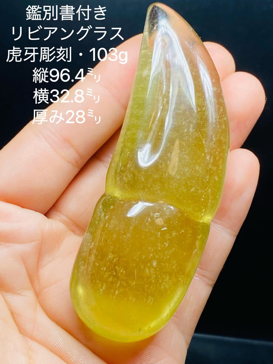 - 鑑別書付き リビアングラス 103g 虎牙彫刻 天然ガラス 隕石 一点物 希少 リビアングラス彫刻