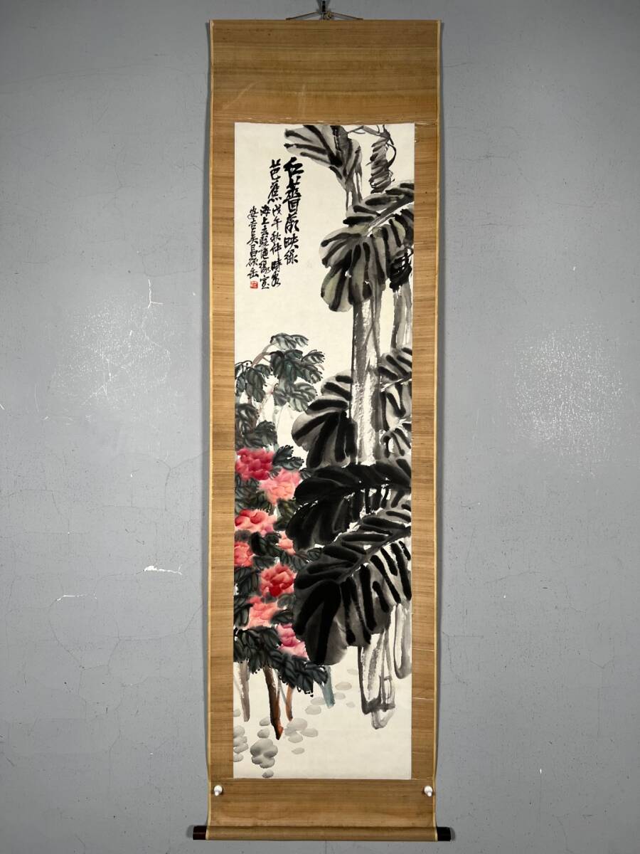 - 古美術 掛け軸 中国・近現代 「呉昌碩書」 紙本 【芭蕉牡丹図】 立軸 書道 巻き物 肉筆保証 唐物 古画 画心151x41cm LT-2501111