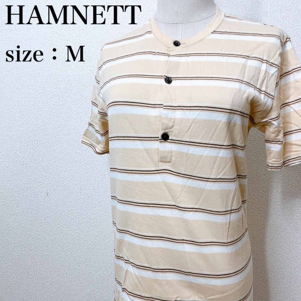> HAMNETT ハムネット カジュアル ボーダー柄ヘンリーネックカットソー ストレッチ シンプル 半袖 着回し抜群 コットン100 ベージュ ん13