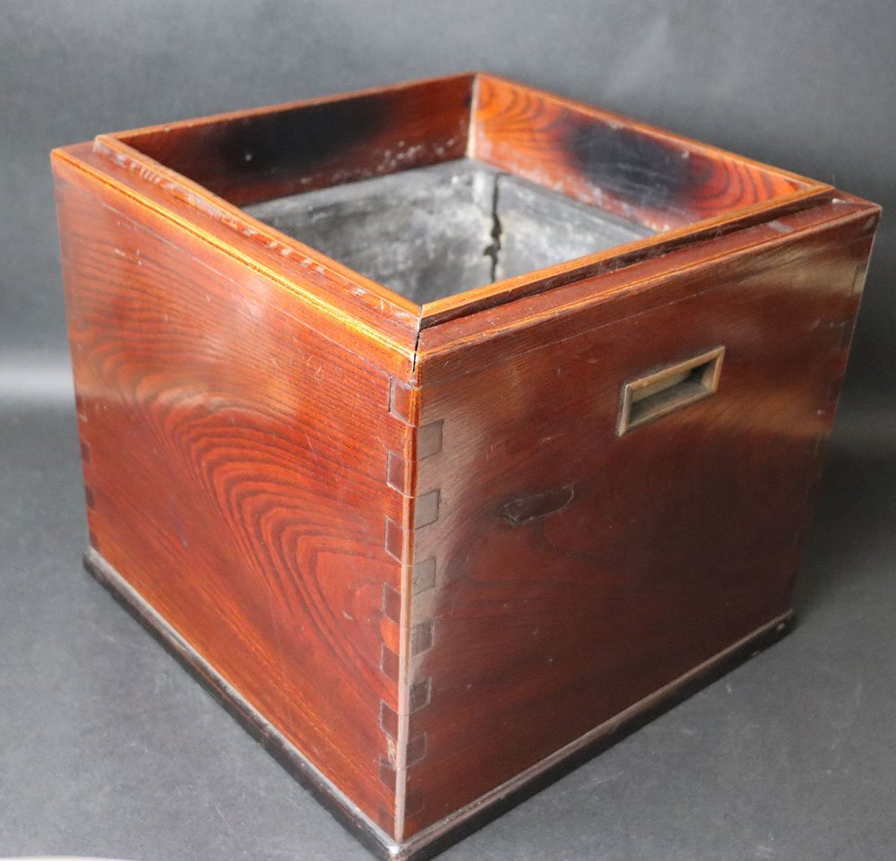 ・商品は 大正~ 手あぶり 古民具 角火鉢 箱火鉢 欅無垢材 お座敷 灰落割れ時代修理跡 です。