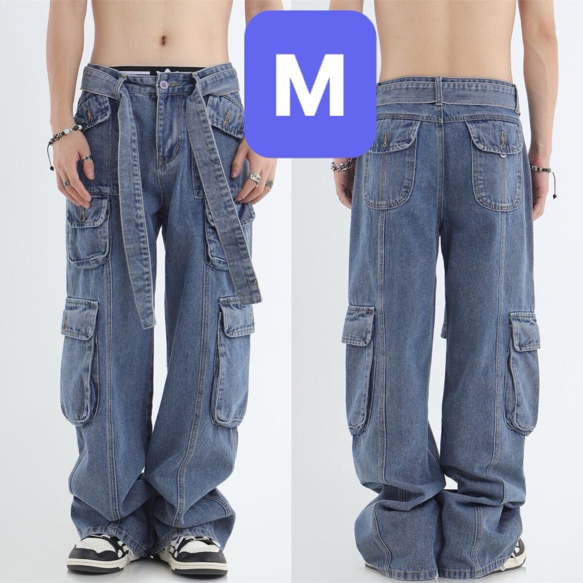 - デニム ワイドレッグ ジーンズ ワイドパンツ ワイドデニム ルーズパンツ ボトムス パンツ メンズ レディース ベルト付き ストリート 青 M
