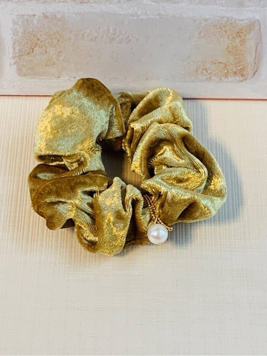 - シュシュ(K-17)ベロア/ハンドメイド/ヘアアクセサリー/パール/黄色/からし色