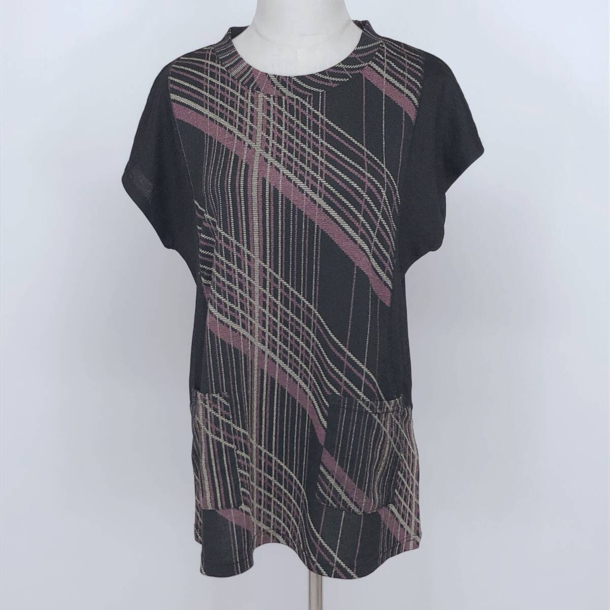 > YX1340 美品 glossi beaut レディース トップス Tシャツ 半袖 サイドポケット 伸縮性 薄手 M~L ブラック チェック柄 涼しげ カジュアル 夏