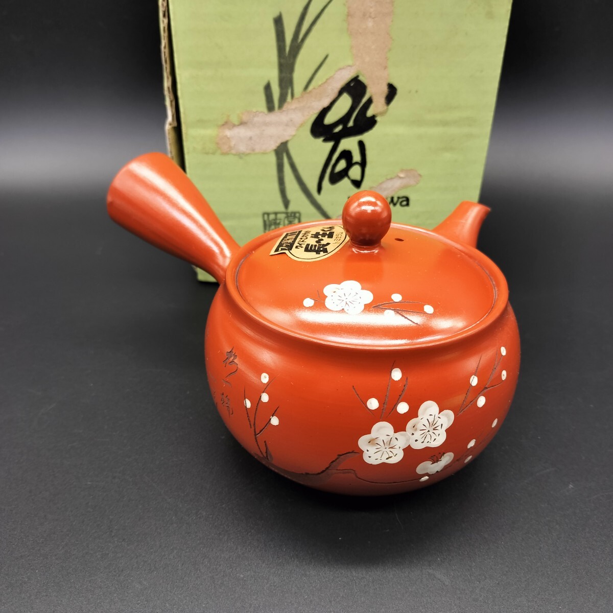 - 常滑焼 急須 朱泥 煎茶道具 横手急須 白梅紋 茶器 チ1