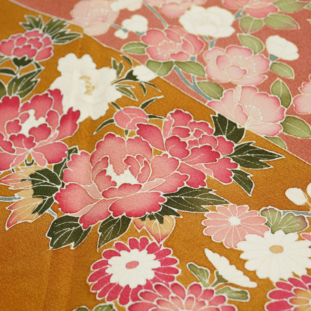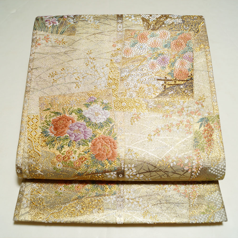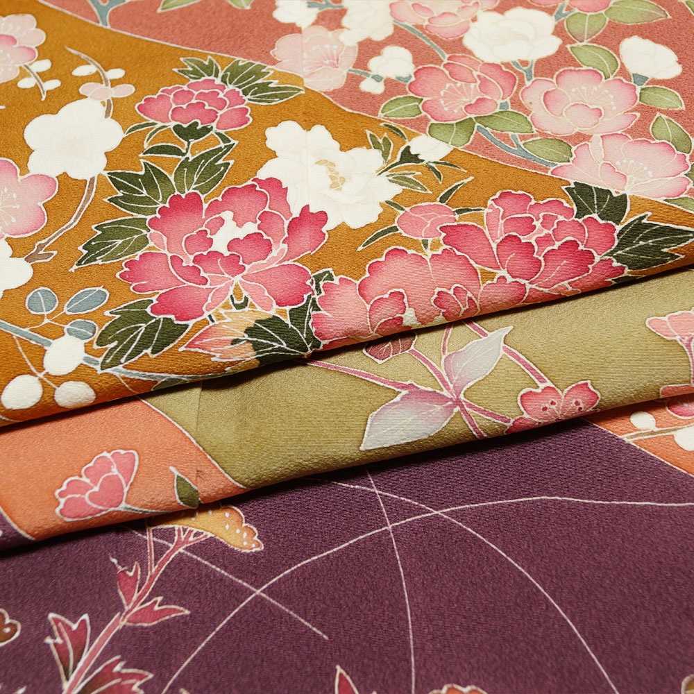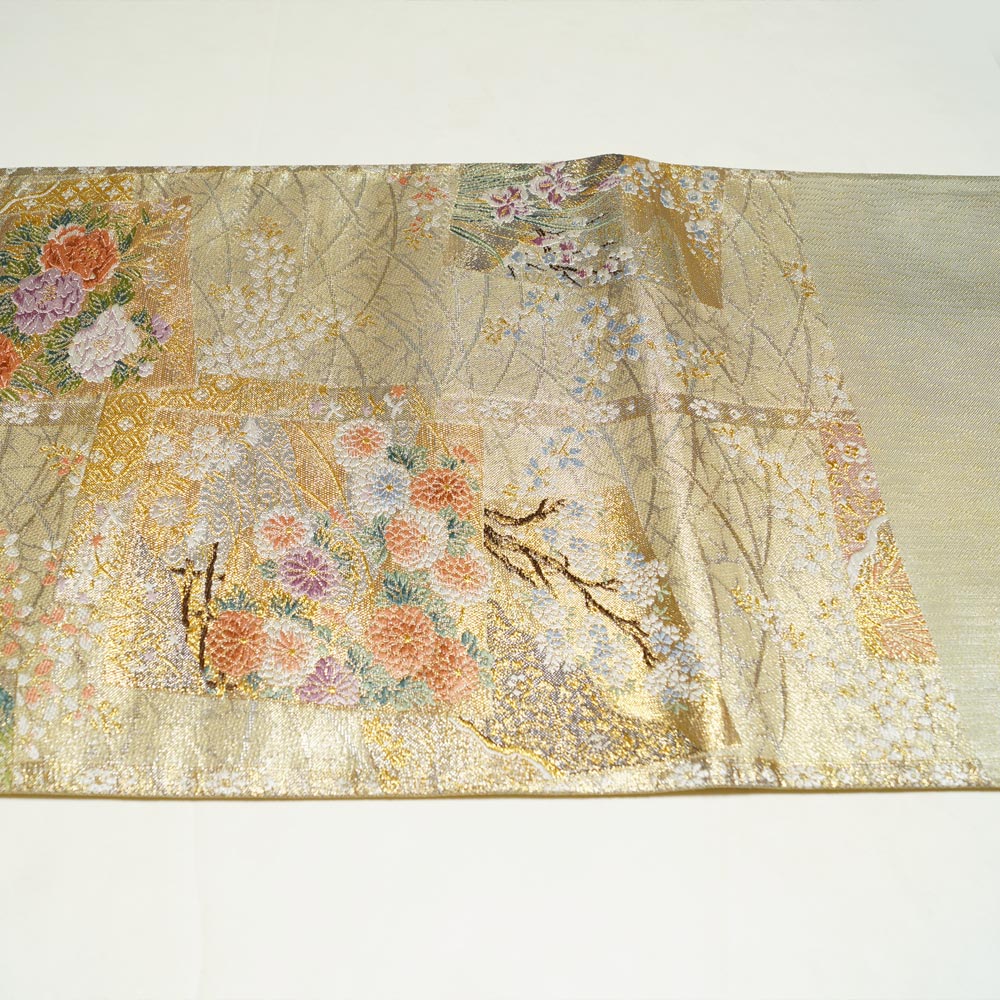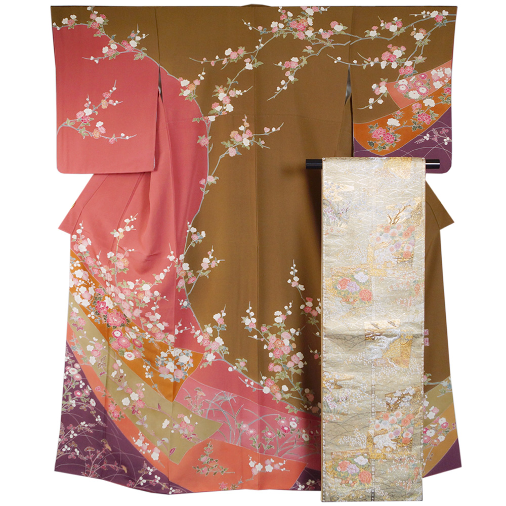 - 着物セット 本加賀友禅 百貫達雄 訪問着・袋帯 2点 セット 染め分けに短冊、百花模様 Lサイズ 作家物 落款有り 中古 訪問着 リサイクル着物