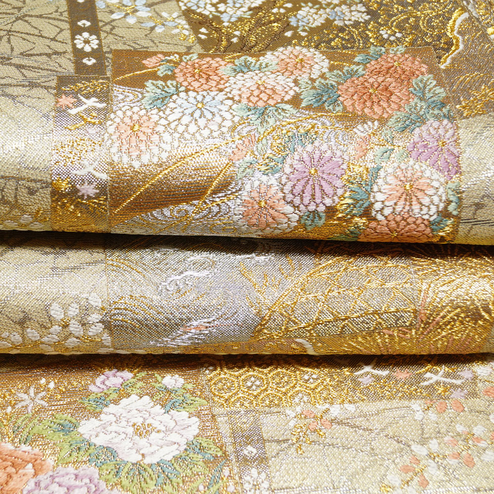 > 着物セット 本加賀友禅 百貫達雄 訪問着・袋帯 2点 セット 染め分けに短冊、百花模様 Lサイズ 作家物 落款有り 中古 訪問着 リサイクル着物