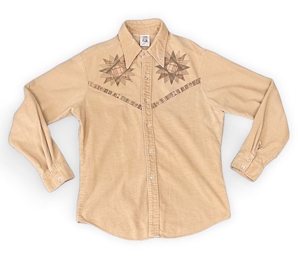 > 70's ケニントン KENNINGTON ビンテージ コーデュロイシャツ 長袖 ネイティブ系 ハンドプリント ベージュ ブラウン [la-1175]