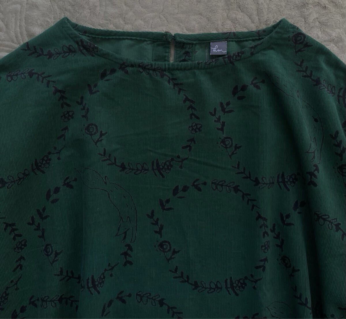 - LM リトルマーケット 花柄 ブラウス コーデュロイ リース柄 肩落ち ワイド 、緑 黒 キツネ 綿100% プルオーバー インド製