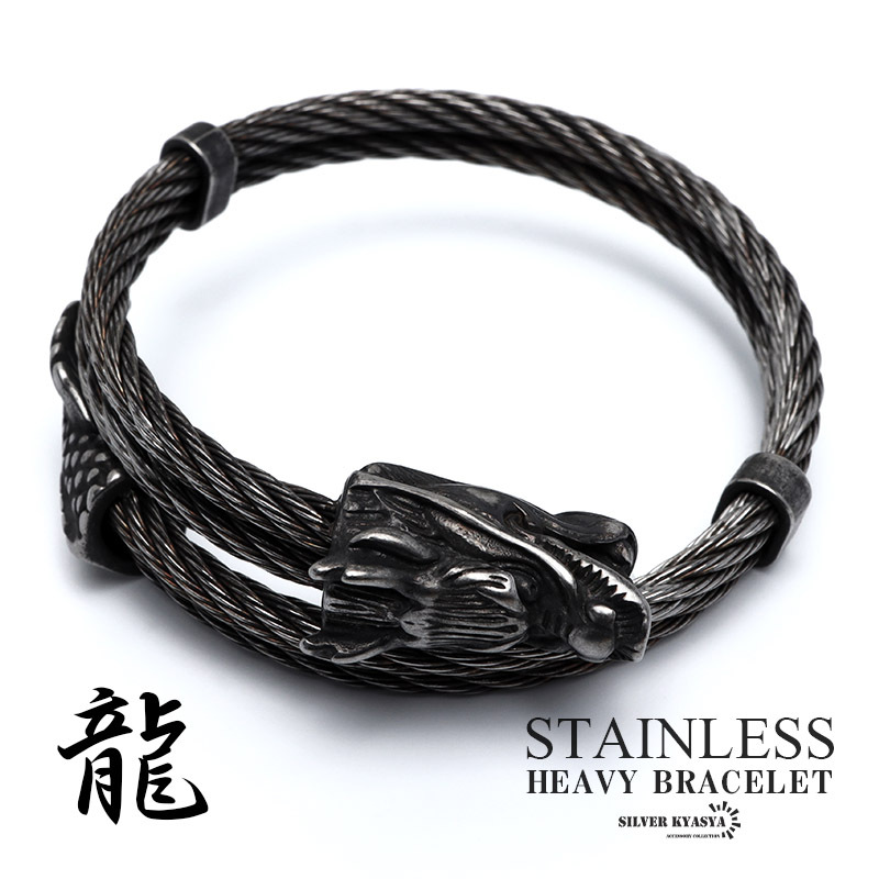 - ステンレス ドラゴンブレスレット 龍 ブラック ヘビーブレスレット ごつめ 燻し風 男性 メンズ 金アレ対応