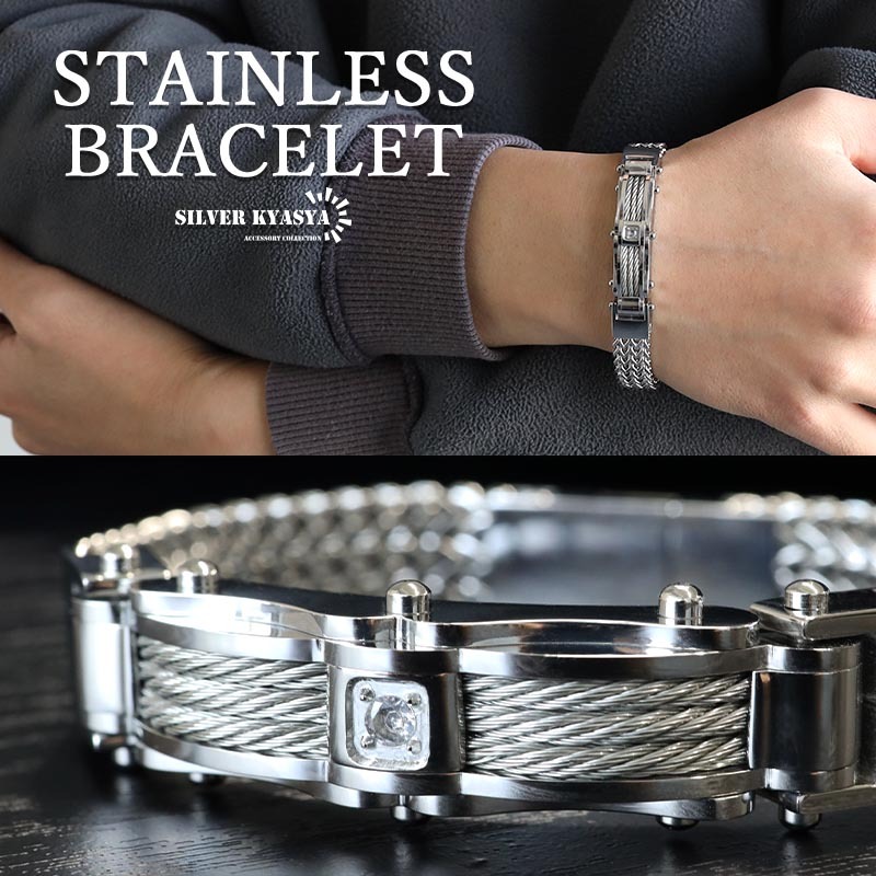 > ステンレス メンズブレスレット ごつめブレスレット チェーンブレスレット シルバー ワイヤー 男性 メンズ 金アレ対応