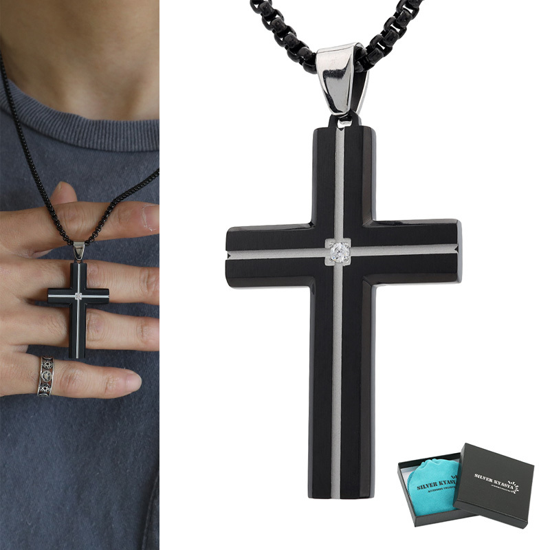 - クロスネックレス ブラック 大きめ 十字架 シンプルネックレス ステンレス メンズ ベネチアンチェーン付き 専用BOX付属