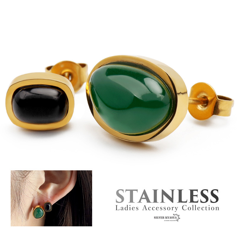 - ピアス ステンレス 金属アレルギー グリーン ブラック 緑 黒 天然石 アゲート メノウ 18KGP スタッドピアス ゴールド