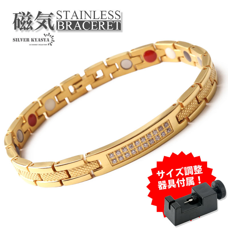 - 磁気ブレスレット ステンレス ビーズ CZ 18k GP ip gold ゴールド 磁力 磁石 金属アレルギー対応 調整器具付属