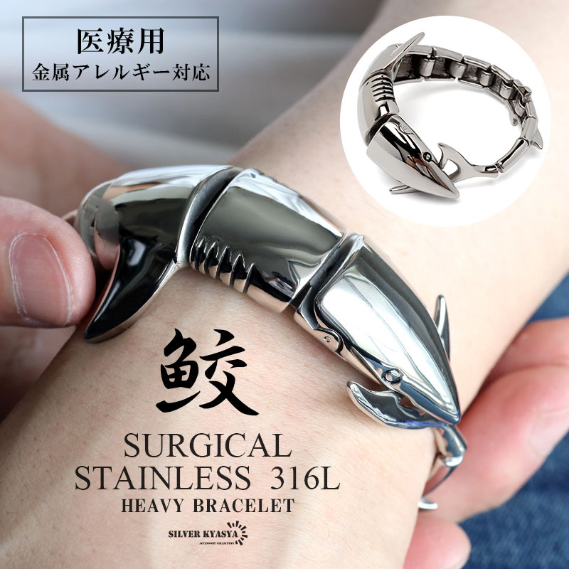 > サージカルステンレス 316L 鮫ブレスレット ごつめブレスレット シルバー シャーク ユニーク 面白 金アレ対応