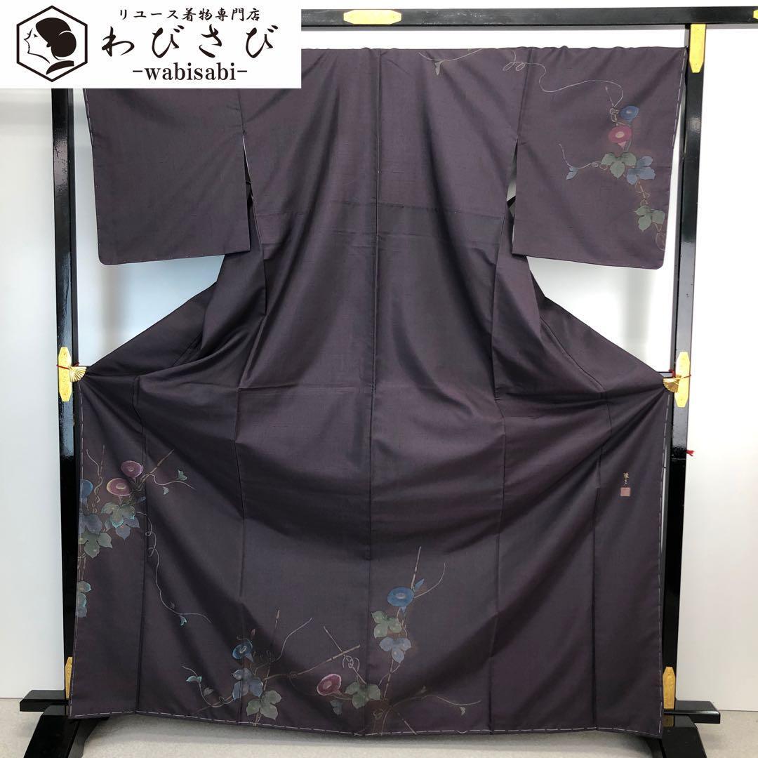 葡萄染色の落ち着きのあるお色味の紬地に上品な朝顔の柄行、一部刺繍でデザインされた雰囲気の良い素敵なお品でございます。