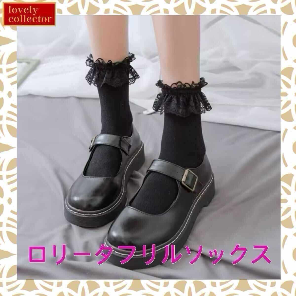 - レディースソックス ショート 靴下 エレガントロリータ フリル 黒 ブラック