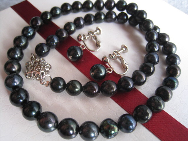> [SAMU]新品同様!!照りアコヤ黒真珠 ネックレス珠7.0~7.8㎜&イヤリング珠7.5mm 2点セット!