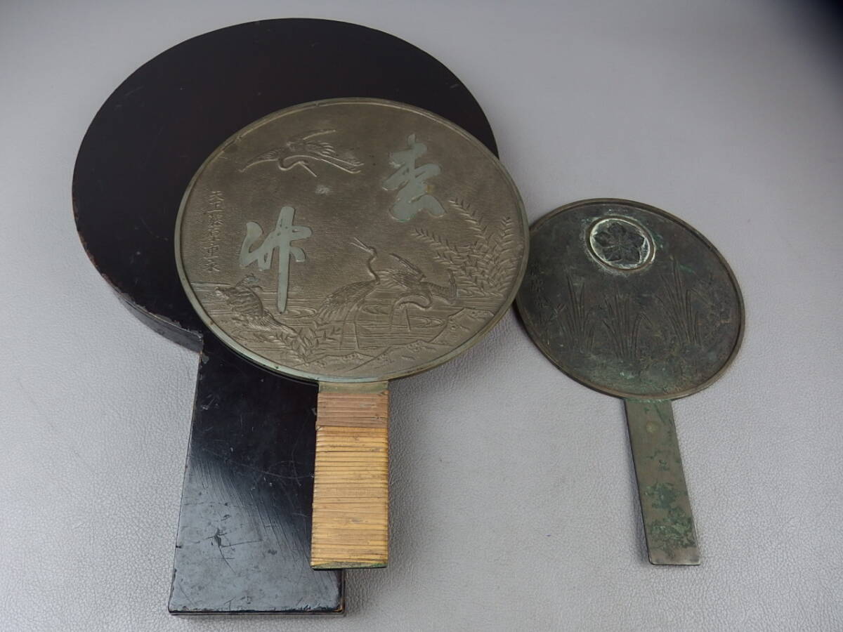 - 【骨董・化粧道具】★古い 唐金製 古銅製 在銘★★古鏡 2点 まとめて fq005sgb22.7 柄鏡 手鏡 和鏡 古民芸
