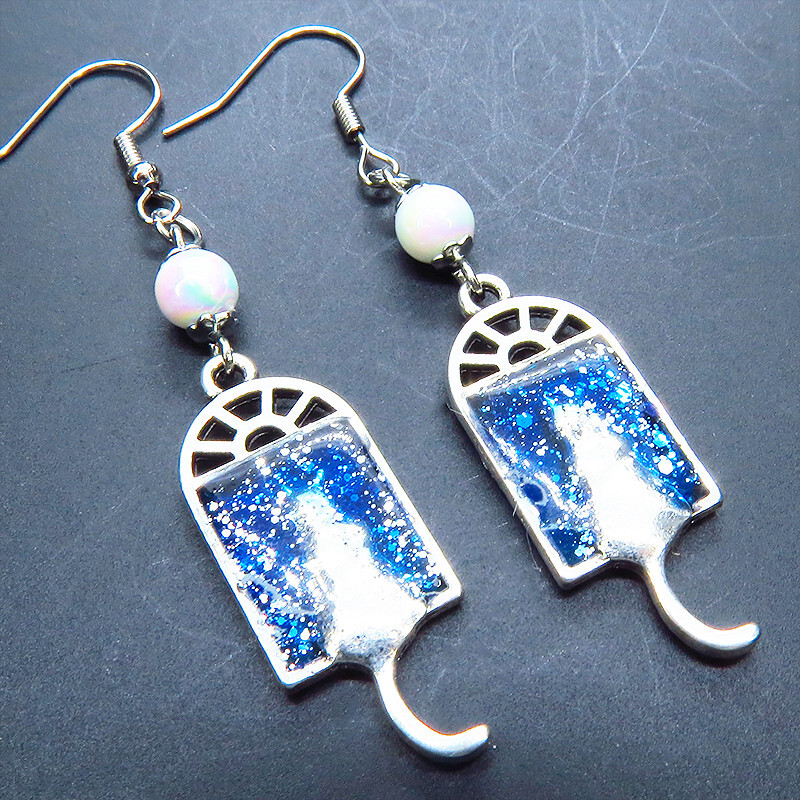 - アンティークシルバー 窓辺にたたずむ猫のピアス マリンブルーレジン レインボーホワイト サージカル可