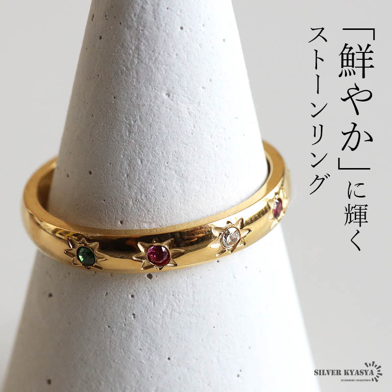 - (22号) ストーンリング ビジューリング 18KGP ゴールド シルバー ステンレス 甲丸リング 星 カラフル アレルギー対応