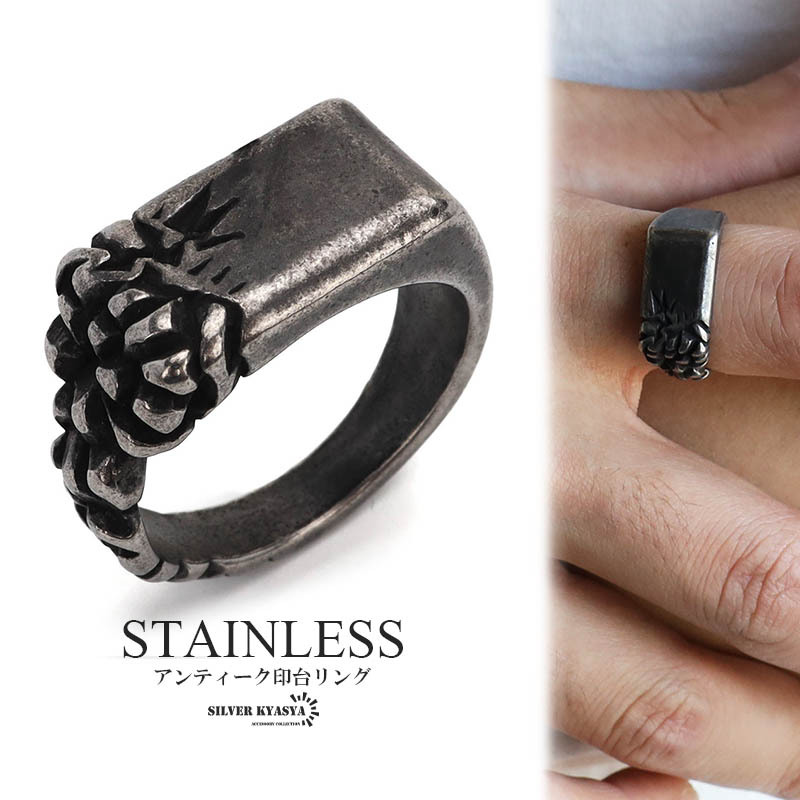 - (22号) ステンレス素材 印台リング 燻 いぶし アンティークシルバーリング メンズ指輪 存在感 石 割れ 岩石