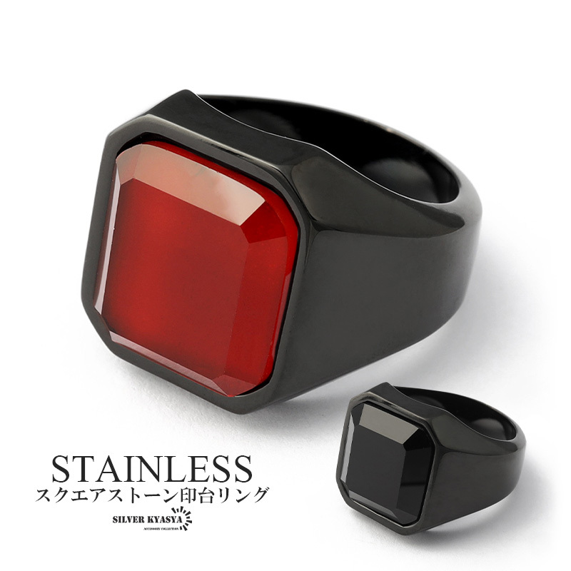 - (レッド、17号) 大粒 ブラック オニキス 印台リング 指輪 ブラックリング 銀 金 ステンレス ハード 重厚 カレッジリング