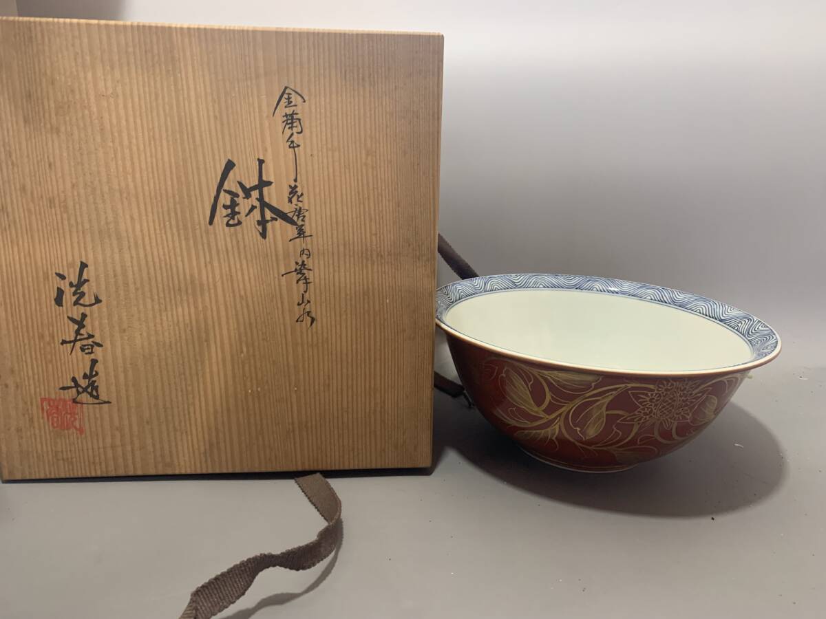 - 金襴手花唐草 内染付山水鉢 洗春 共箱