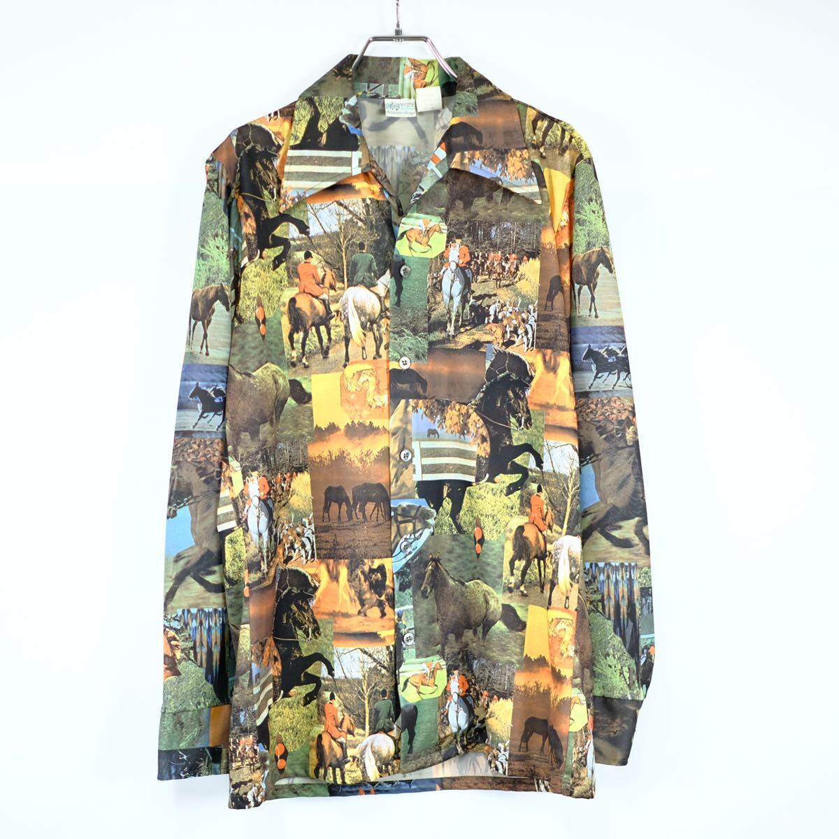 > 1970s ビンテージ 総柄ポリシャツ 馬 フォトプリント 開襟シャツ 古着屋 アート 競馬 乗馬 長袖シャツ ヴィンテージ