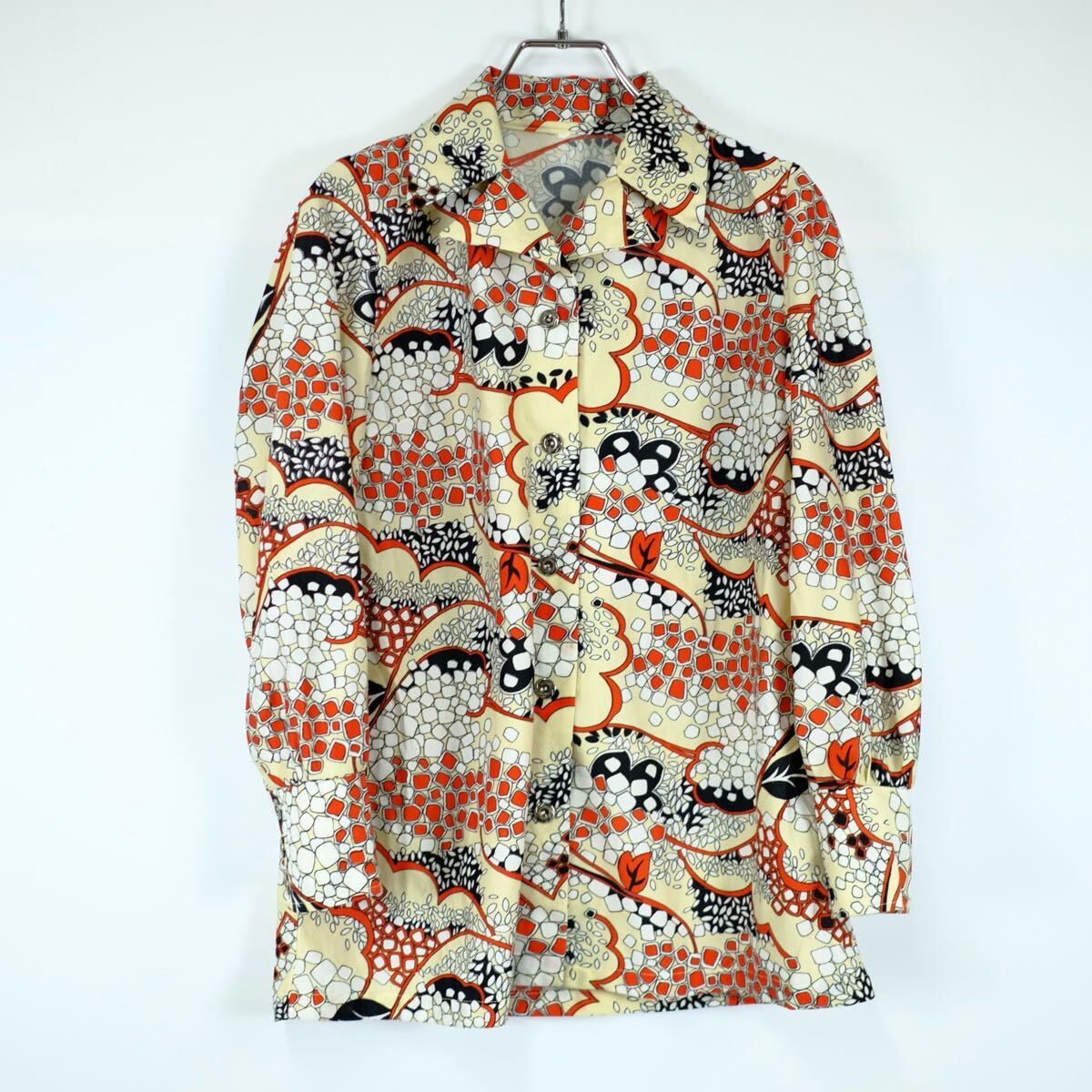 - 1970s ビンテージ 総柄デザイン ポリシャツ 和柄 アート 古着屋 ヒッピー 開襟シャツ アロハ