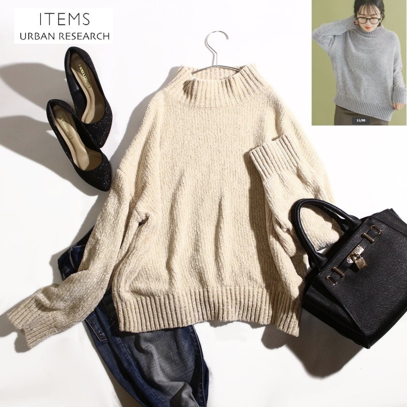 > 美品 厚手 ITEMS アイテムズ URBAN RESEARCH アーバンリサーチ ベロアモール ハイネックニットセーター ライトベージュ もっちり セーター