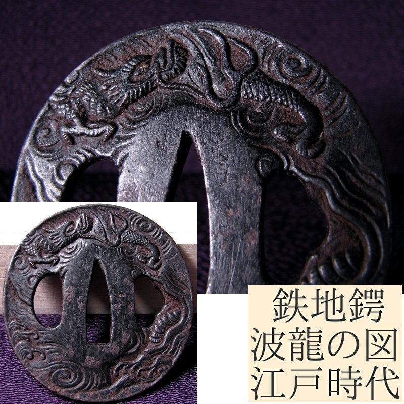 - 時代武具 鉄地鍔 波龍の図 桐箱付 江戸時代/鐔/25a066